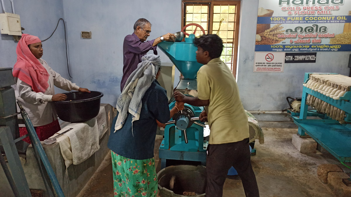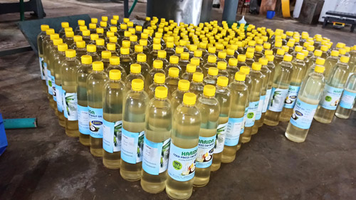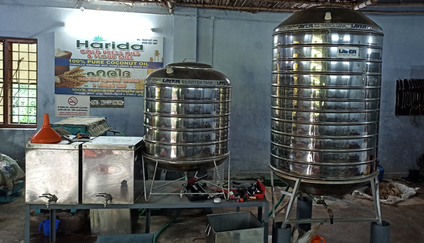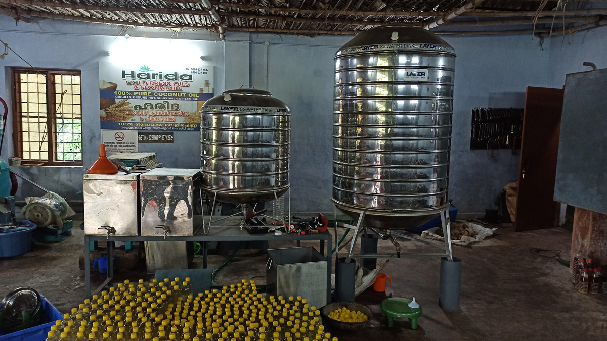 At Harida Oil Mill, we make coconut oil directly from the Kerala coconut copra without adding or removing anything. First we cut the copra into pieces. It is pressed in a cold press machine. The coconut cake comes out very nice in this process. After pressing, the oil comes out, after a day the coconut oil is extracted and passed through a filter machine, filtered and bottled.